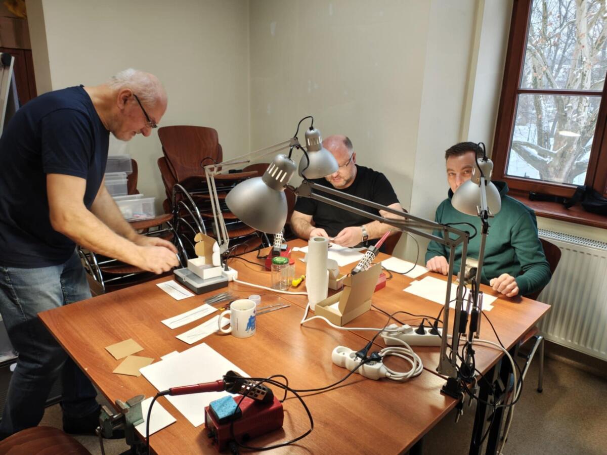 Hitem spotkania okazały się warsztaty lutowania blaszek zorganizowane przez Zbyszka. Chętnych było sporo i po spotkaniu można stwierdzić, że fachowców od lutowania blaszek mamy w klubie sporo. Jeszcze parę lekcji i może nawet most na Ludwikowice sami polutujemy.