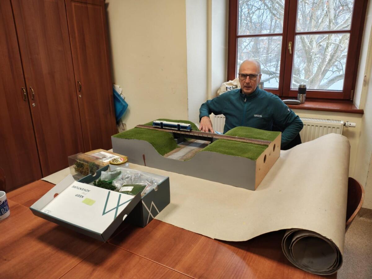 Robert przywiózł skrzynkę z mostem do dalszych prac nad zielenią. Z pomocą Andrzeja skrzyneczka nabiera ładnego wyglądu.