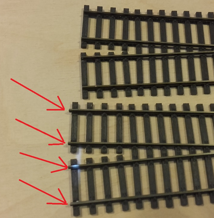 I już można montować na modułach. Oczywiście potem szutrowanie i teren ale to już tematy na inne poradniki. Widok końcówek szyn rozjazdu gdzie należy nałożyć podkłady (jedna ze stron rozjazdu).