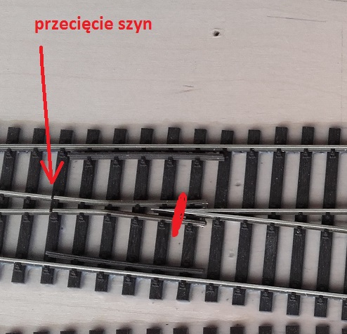 Obcięcie szyn wystających w rozjeździe (czerwone strzałki), najlepiej szlifierką na równo z podkładem.